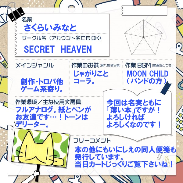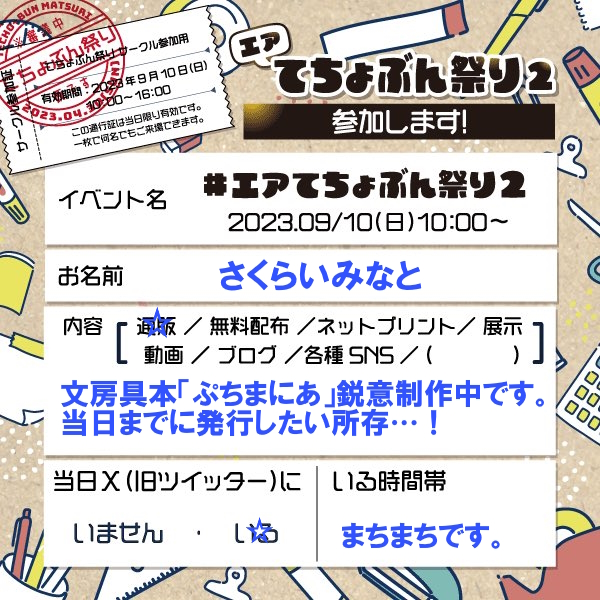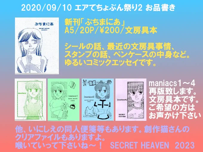 出展内容 同人誌・ペーパー・紙モノ 文房具本新刊「ぷちまにあ」出します!鋭意制作中! まとめサイト Xのアカウントはこちら Tweets by minato_sakurai 投稿ナビゲーション 白熱球 | おきたきお/あゆみんさん snoblen|いろは蛙手さん