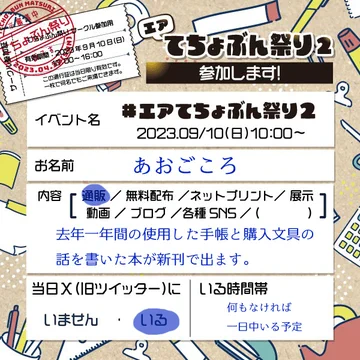 出展内容 自分の使っている手帳や文具のエッセイです。めちゃくちゃユルい使い方なので気楽にお読みください。 通販はこちら Xのアカウントはこちら Tweets by yoimachiblue 投稿ナビゲーション 103の店|とみたまさん AJISAI|あじさん