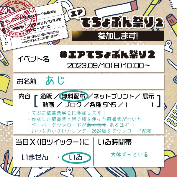 出展内容 蔵書票、データ配信 てぶま蔵書票展2 参加します!毎年作ってる小さいカレンダー2024年版を公開予定。間に合えばペーパーみたいなやつも。 詳細はこちら(はてなブログ) Xのアカウントはこちら Tweets by aji_ig 投稿ナビゲーション コビンラボ | ワタリスミさん Laboratorium AYA(AYA工房)|AYAさん